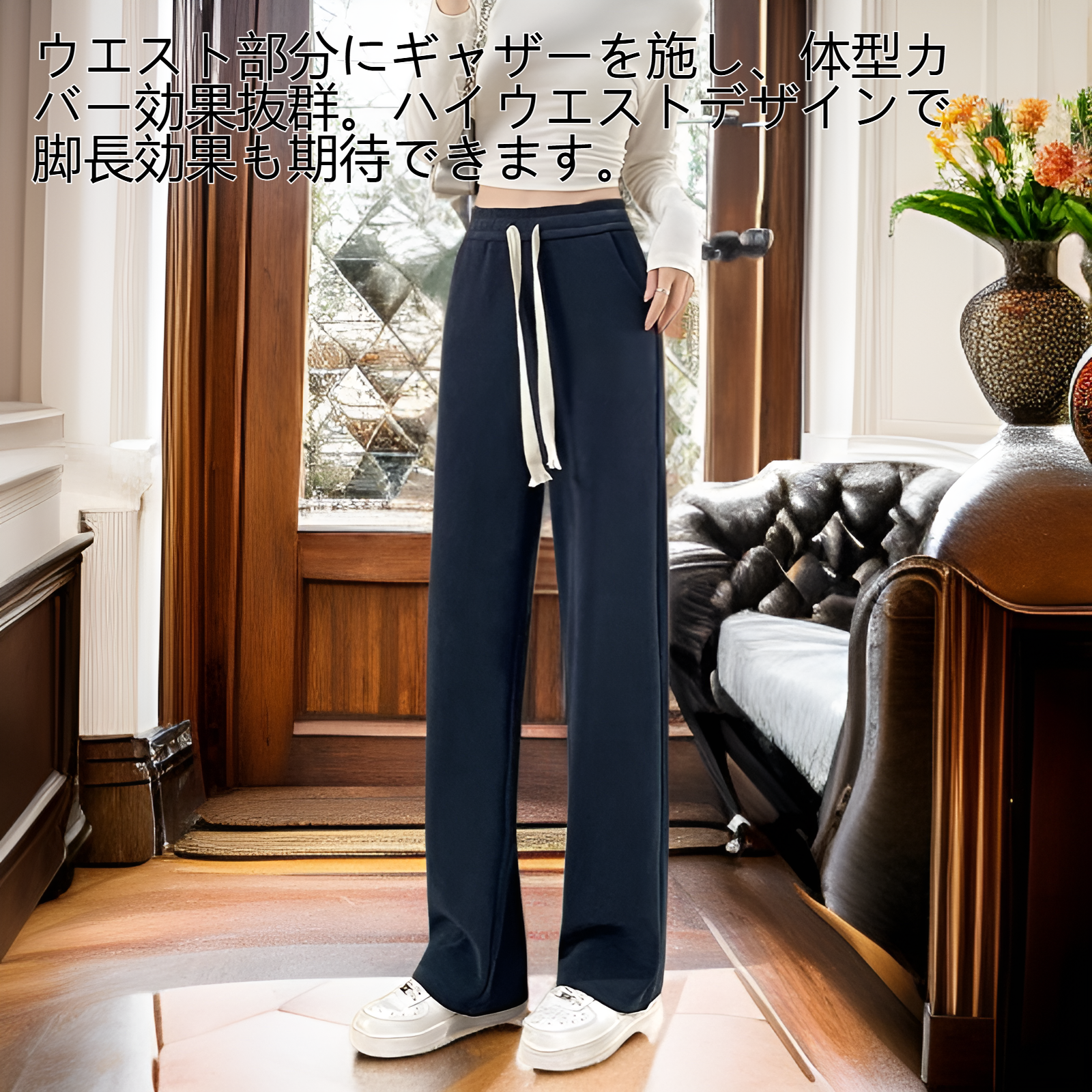 ● ウエスト部分にギャザーを施し、体型カバー効果抜群。ハイウエストデザインで脚長効果も期待できます。